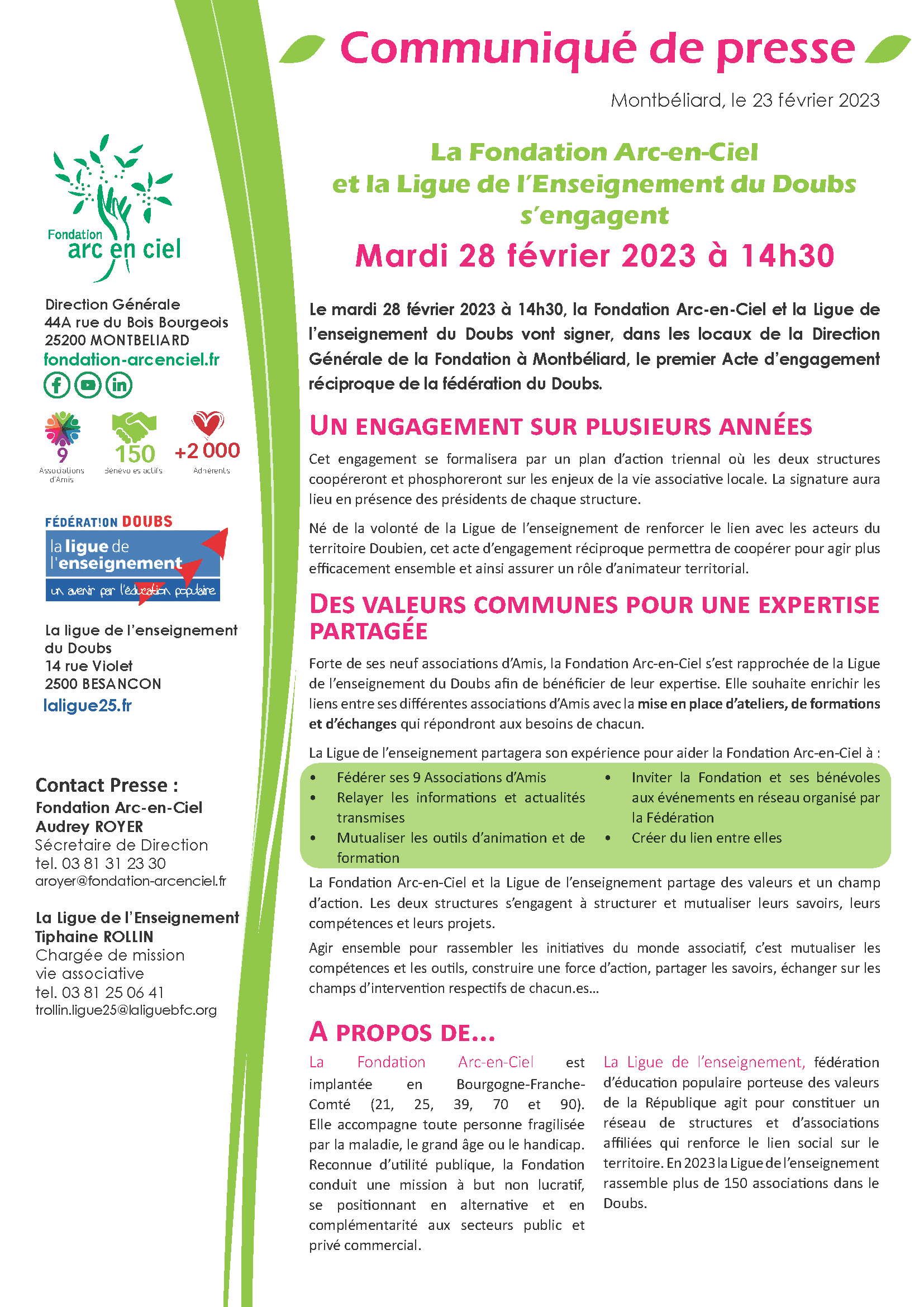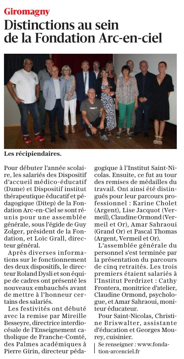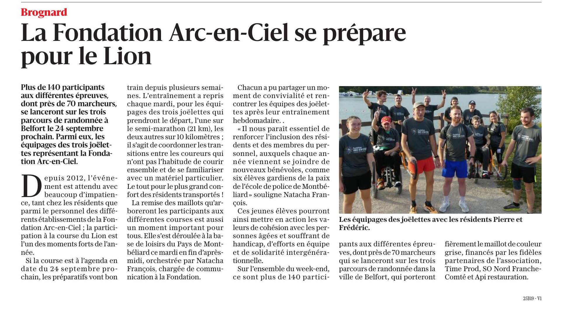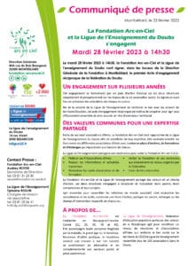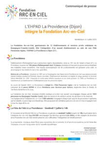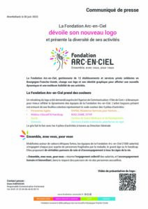 Espace presse Accueil > Espace presse Communiqués de presse L’EHPAD La Providence (Dijon) intègre la Fondation Arc-en-Ciel Juillet 2023 La Fondation Arc-en-Ciel dévoile son nouveau logo Juillet 2023 La Fondation Arc-en-Ciel et la Ligue de l’Enseignement du Doubs s’engagent Février 2023 La Fondation Arc-en-Ciel prête pour la Course du Lion 2022 Septembre 2022 Restitution de l’action culturelle » La musique s’invite » Juillet 2022 5ème édition des Olympiades de l’Arc-en-Ciel Mai 2022 Innov’EHPAD Avril 2022 40ème Noël de la Fondation Arc-en-Ciel Novembre 2021 Inauguration des nouveaux locaux de Soli-Cités Aides Novembre 2021 On parle de nous La Fondation Arc-en-Ciel se prépare pour le Lion Septembre 2023 Fake news Septembre 2023 Distinction à la Fondation Septembre 2023 Don de la Grayloise : toujours plus haut, toujours plus fort ! juin 2023 Les parcours du Cœur ont été un succès Mai 2023 La Fondation Arc-en-Ciel est prête pour le Lion Septembre 2022 Aides à domiciles : l’humain à cœur Septembre 2022 Le grammage aux petits oignons du CRCP de Franche-Comté Août 2022 Futurs IMP et ITEP: le cadre de vie sera conservé Juillet 2022 Innov’EHPAD prend soin des résidents et des soignants Juillet 2022 La musique s’invite à l’Institut Perdrizet Juillet 2022